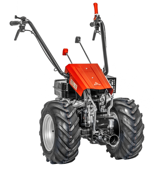 Handliche Bauweise mit tiefem Schwerpunkt und vibrationsgedämpften Holm für erschütterungsfreien Betrieb. Ausdauernde Arbeiten durch Fahrantrieb über Ölbadgetriebe mit 6 Gängen (3 + 3), Sicherheits-Stopp-Einrichtung und Wickelschutz an den Achsen.