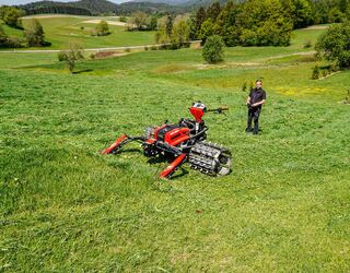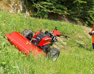 Viel Bodenfreiheit, tiefer Schwerpunkt, Motor- und Getriebegehäuse sowie die Achsen sind durch die spezielle Unterbodenkonstruktion massiv geschützt. Die Motorposition liefert ein optimales Auflagegewicht der Mähbalken für hohe Hangsicherheit.