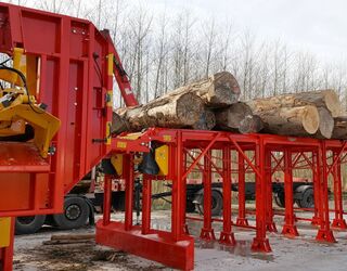 - Stamm-Auflagetisch (Querförderer) mit 3 oder 4 Strang : bis zu 8 Meter Nutzlänge für Stationäre Anlage. Ideal für Stämmelänge bis zu 4 Meter.
