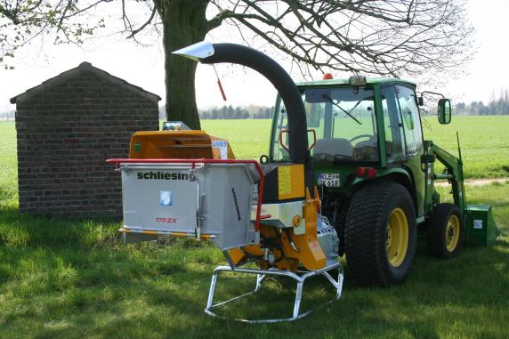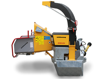 Einzugstrichter mit lackierter Klappe. Ausblasrohr schwenkbar mit verstellbarer Streuklappe. Geräuschdämmung für Hackergehäuse und Ausblasrohr. Zwei Bedieneinheiten (rechts und links), zwei Not-Halt-Taster außen an der Trichterklappe, sowie ein Not-Halt-Taster oben mittig auf dem Trichter.