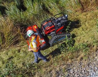Die hohe Steigfähigkeit und Belastbarkeit lassen den CRAWLER auch starke Hangneigungen bis zu einem Böschungswinkel von 120 Prozent meistern. Durch die Fernsteuerung mit hoher Reichweite lässt sich der CRAWLER bequem vom Begleitfahrzeug aus bedienen oder stehend in der Nähe des Arbeitsbereichs. Die Maschine ist einfach auf der Ladefläche zu transportieren und sorgt durch die Unabhängigkeit vom Begleitfahrzeug für freie Sicht auf den Arbeitsbereich.